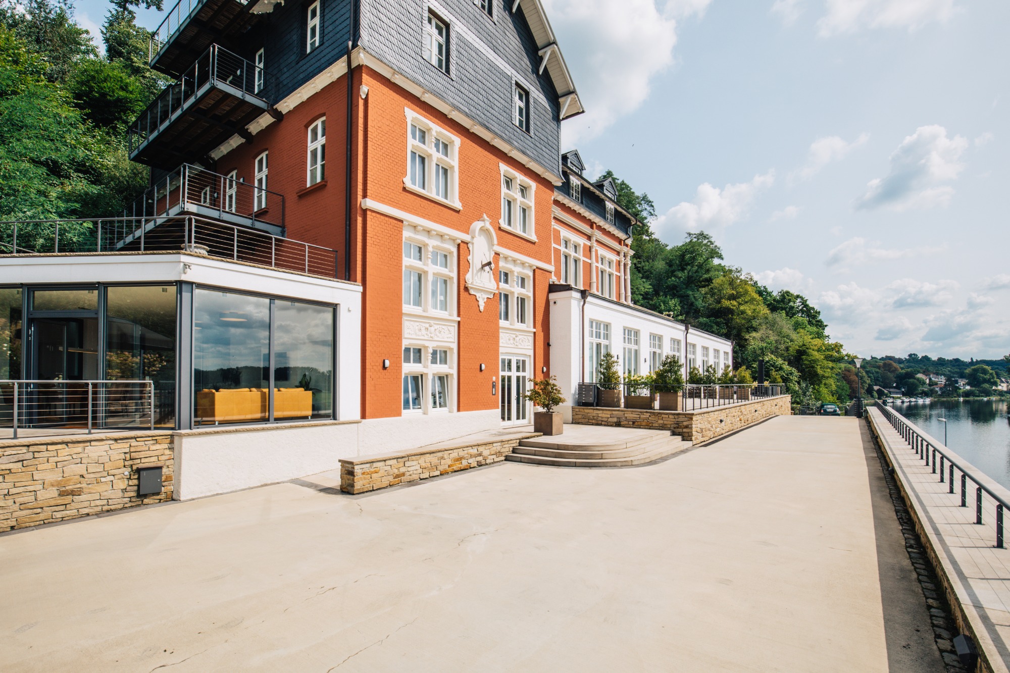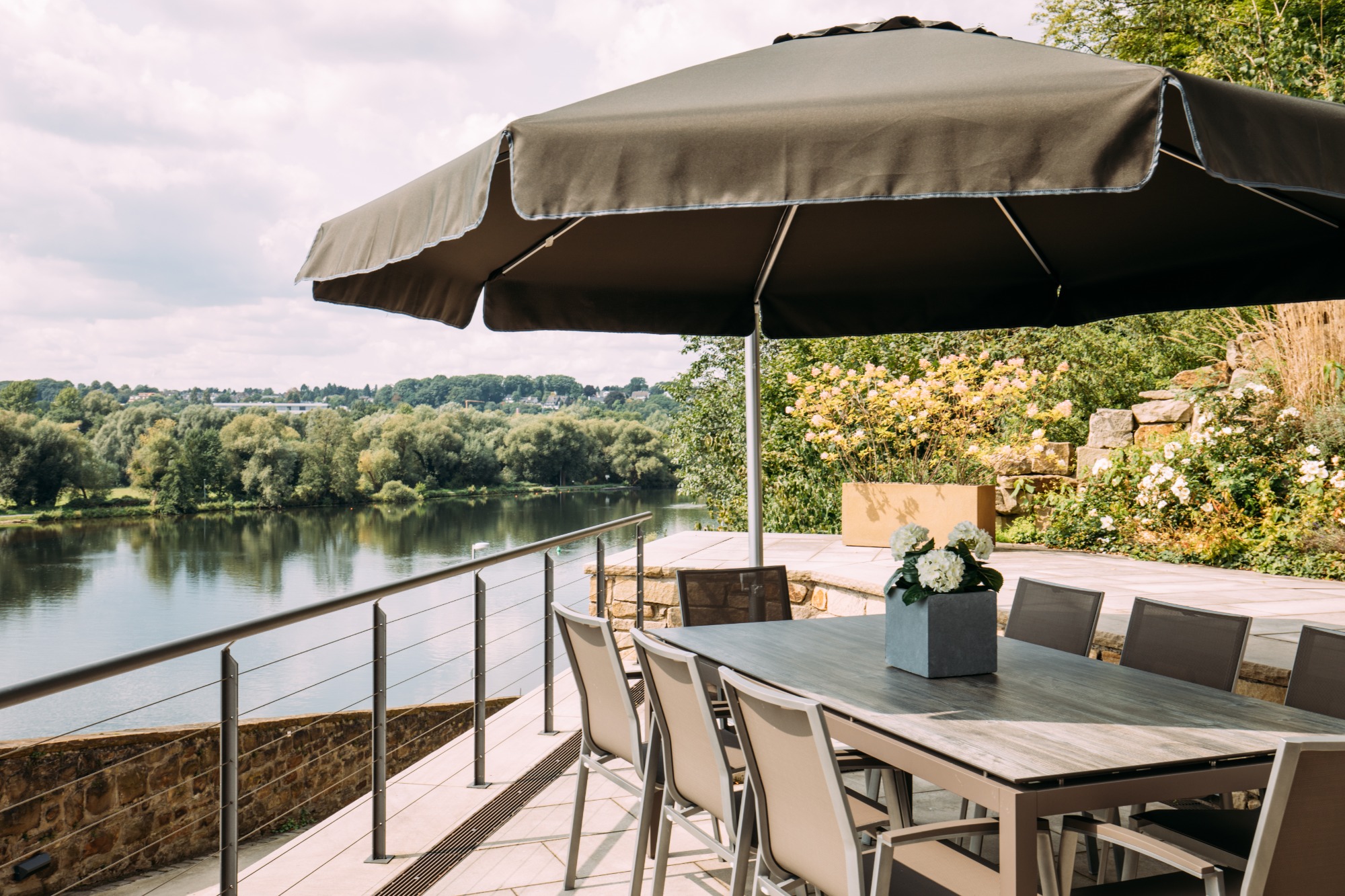 Der lichtdurchflutete Trainingsraum bietet modernste Technik und flexible Gestaltungsmöglichkeiten. Die großzügige Terrasse und der Außenbereich laden zu inspirierenden Pausen ein – optional mit Catering oder Grillen in entspannter Atmosphäre.